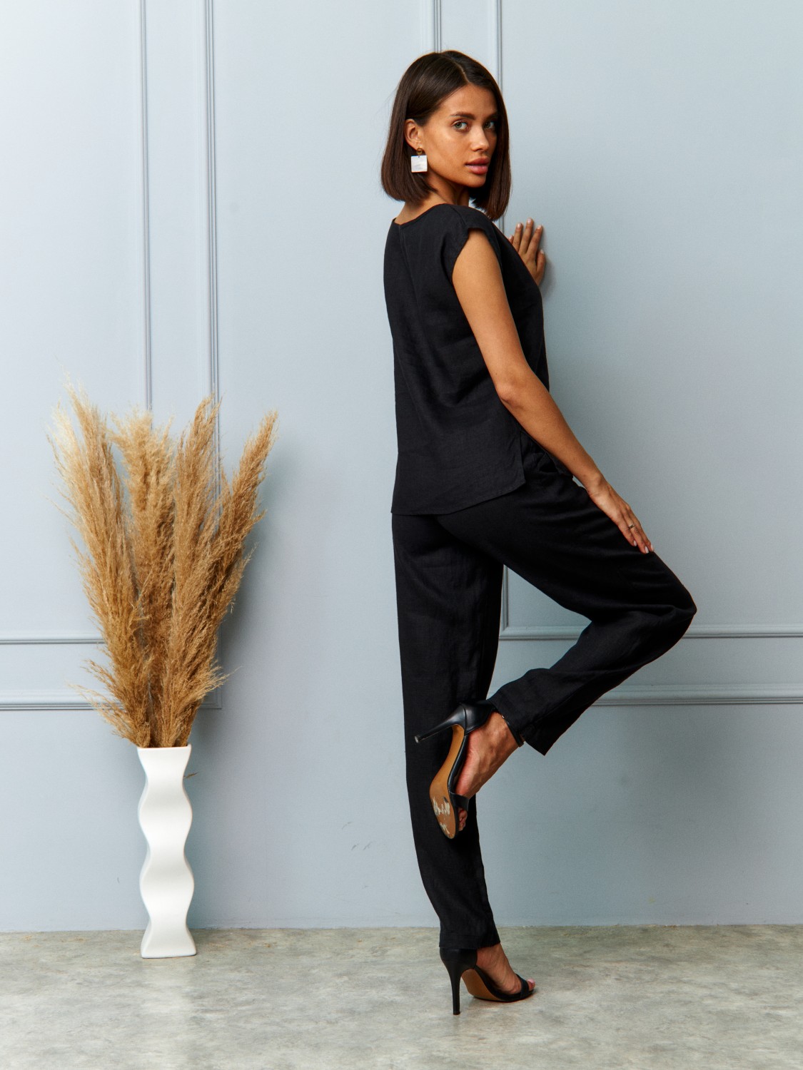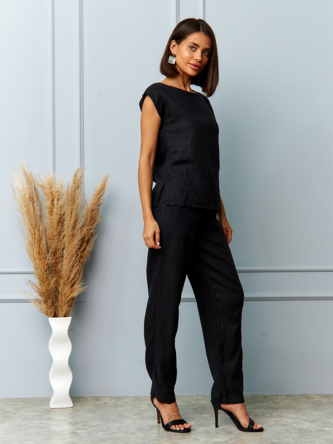 Костюм льняной ANNAMAX - это идеальный выбор для современных женщин, ценящих комфорт и стиль. Сшит из 100% льна, он обеспечивает превосходную вентиляцию и обладает антибактериальными и гипоаллергенными свойствами, что делает его комфортным даже в жаркую погоду. Модель брючного костюма из натуральной ткани с широкими брюками и топом без рукавов.