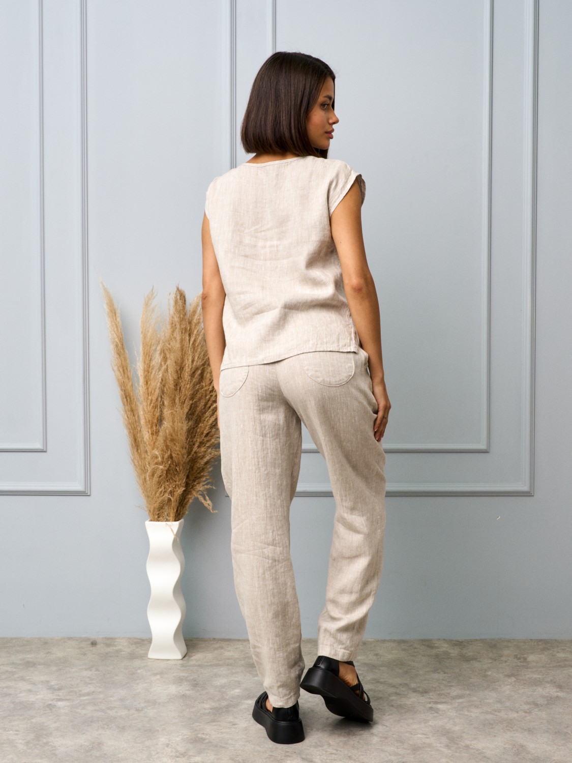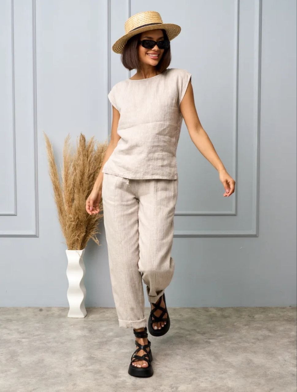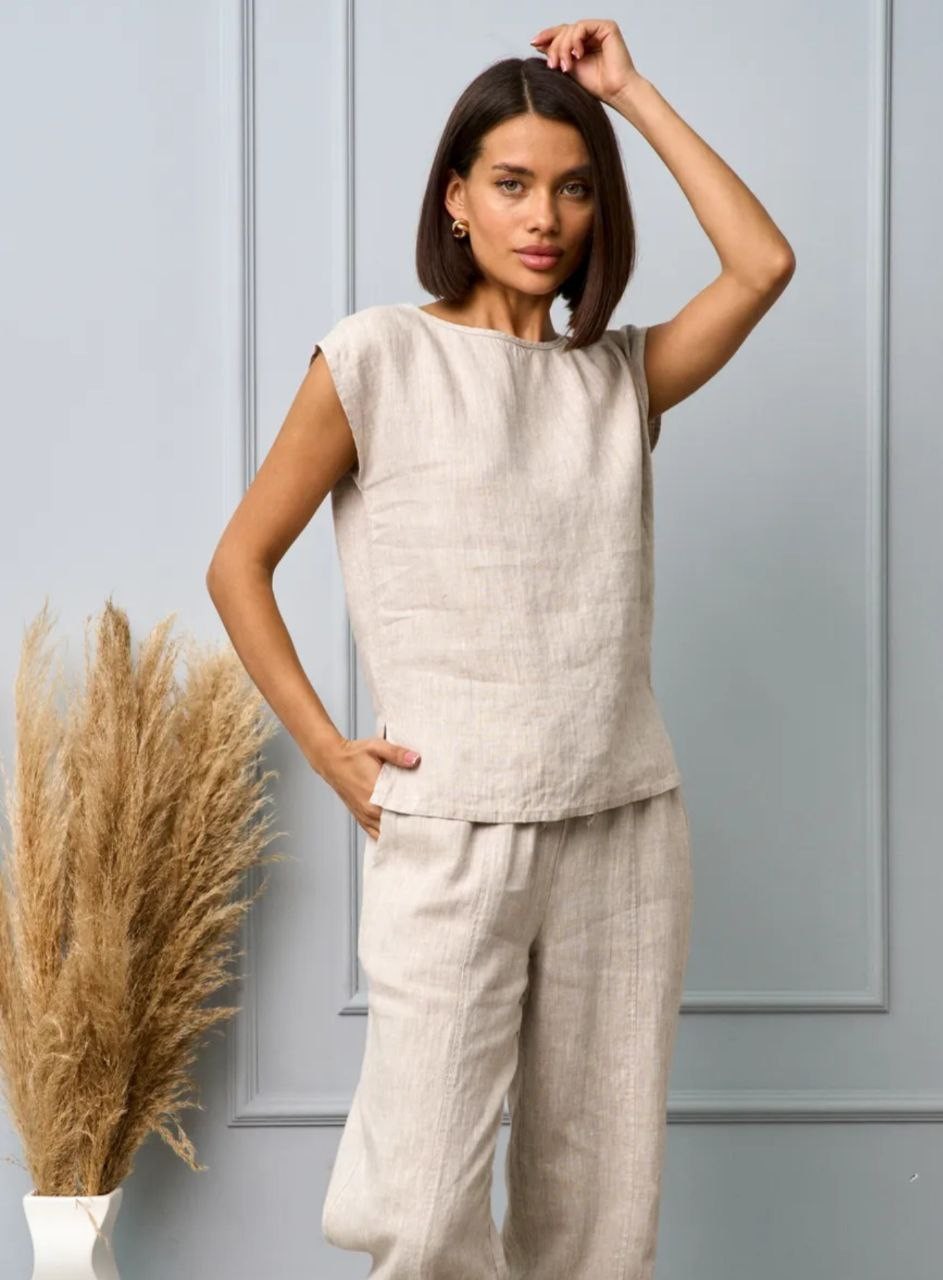 Костюм льняной ANNAMAX - это идеальный выбор для современных женщин, ценящих комфорт и стиль. Сшит из 100% льна, он обеспечивает превосходную вентиляцию и обладает антибактериальными и гипоаллергенными свойствами, что делает его комфортным даже в жаркую погоду. Модель брючного костюма из натуральной ткани с широкими брюками и топом без рукавов.