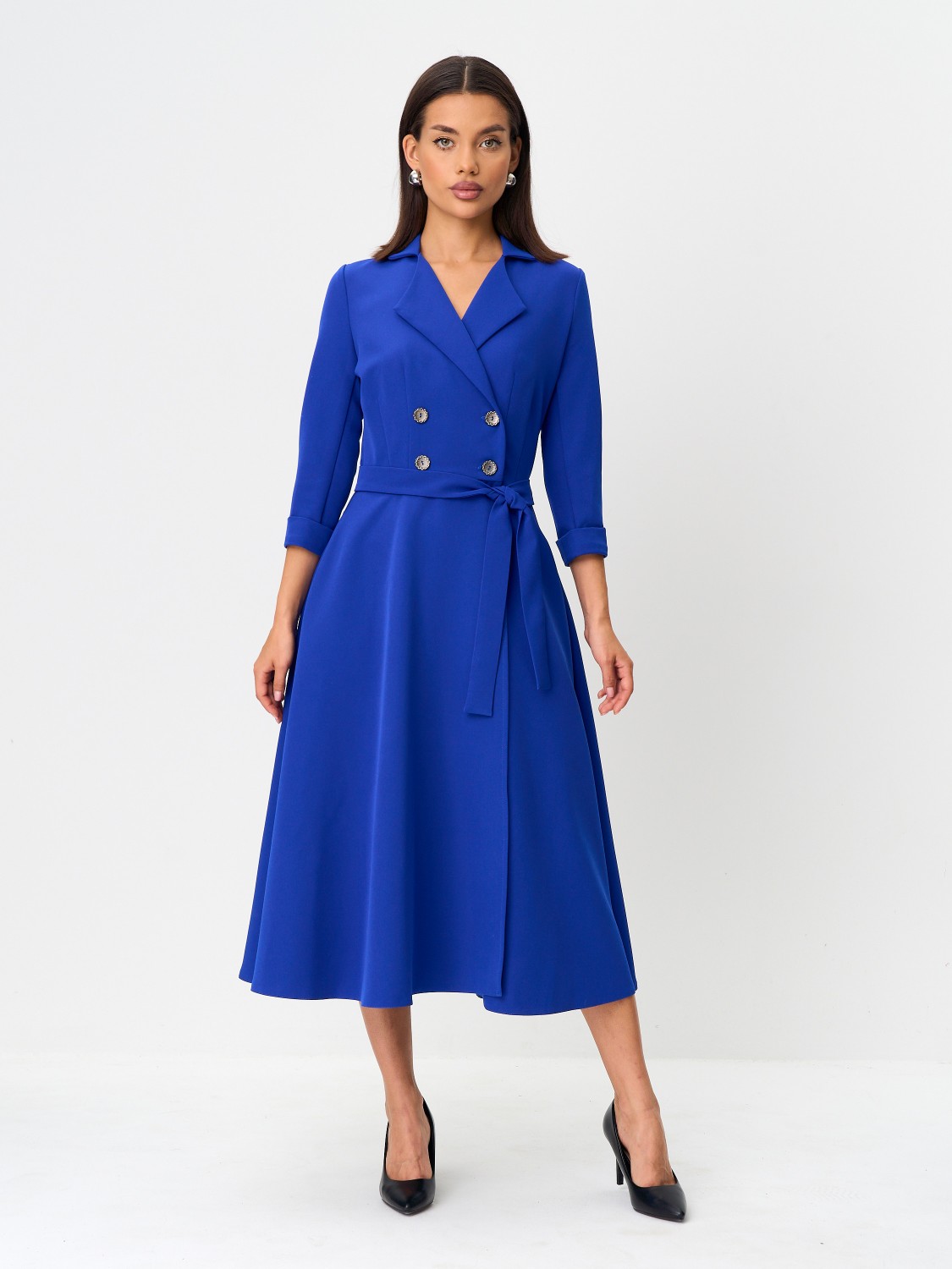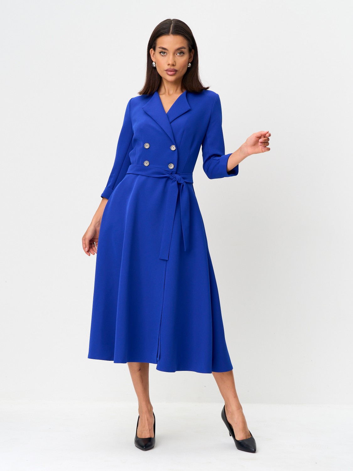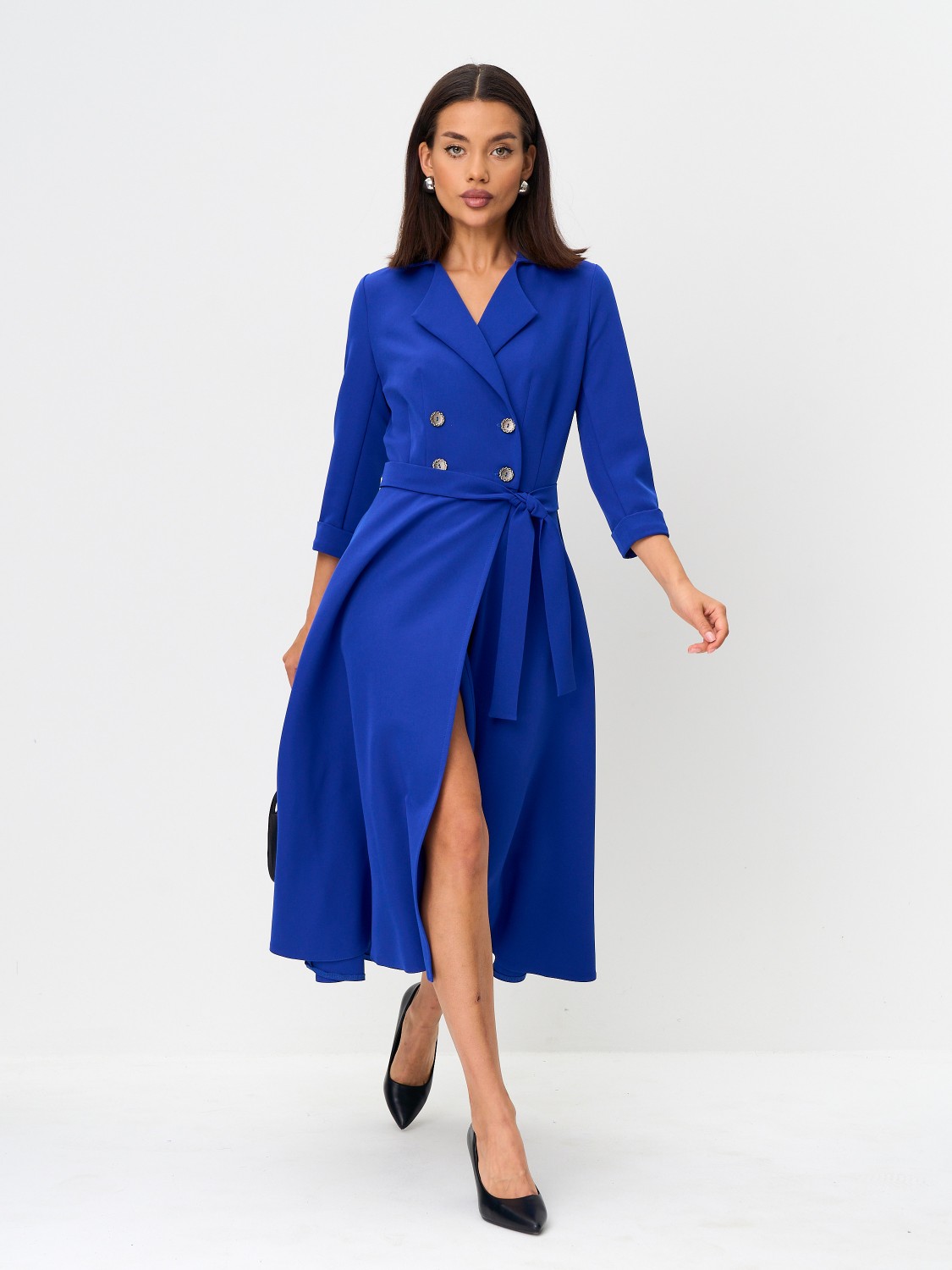 Стильное платье - пиджак миди с двубортным кроем и поясом — идеальное решение для тех, кто ценит элегантность и комфорт. Платье офисное универсального фасона на запах с отложным воротником и длинными рукавами подчёркивает фигуру, визуально стройнит и подходит для любого типа телосложения. Плотная ткань женского платья с добавлением эластана не просвечивает, устойчива к деформации и отлично держит форму. Высокий разрез спереди добавляет образу женственности и лёгкости в движении. Пояс на талии позволяет подчеркнуть силуэт и создать выразительный акцент. Длина миди до середины икры делает модель уместной в офисе, на деловой встрече, свадьбе в качестве гостевой одежды или вечернем выходе. Легко комбинируется с туфлями, балетками, кроссовками — подходит для создания образов в стиле smart casual, офисный шик или уличная мода. Универсальный крой и качественный крой делают это платье must-have в современном гардеробе.