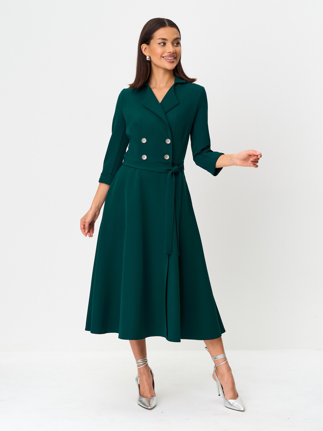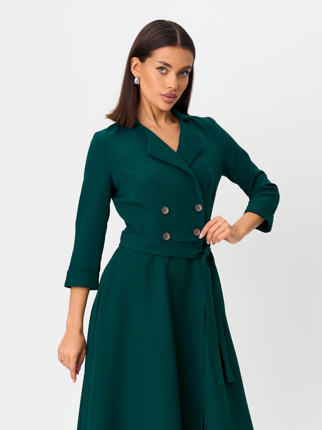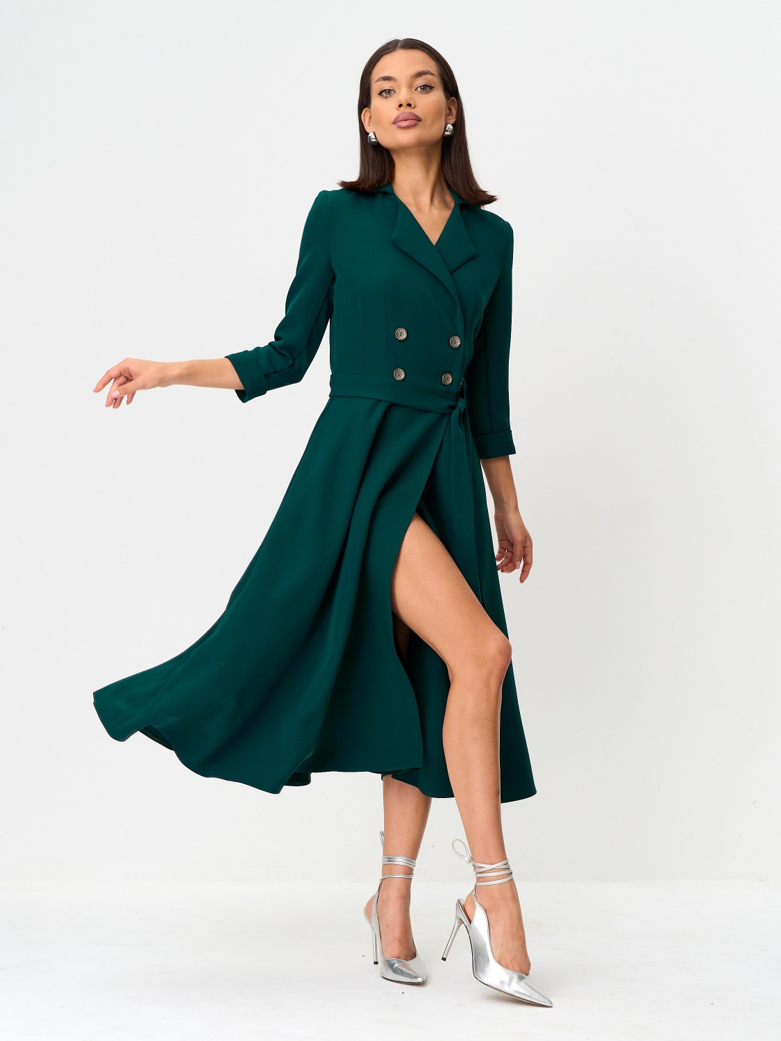 Стильное платье - пиджак миди с двубортным кроем и поясом — идеальное решение для тех, кто ценит элегантность и комфорт. Платье офисное универсального фасона на запах с отложным воротником и длинными рукавами подчёркивает фигуру, визуально стройнит и подходит для любого типа телосложения. Плотная ткань женского платья с добавлением эластана не просвечивает, устойчива к деформации и отлично держит форму. Высокий разрез спереди добавляет образу женственности и лёгкости в движении. Пояс на талии позволяет подчеркнуть силуэт и создать выразительный акцент. Длина миди до середины икры делает модель уместной в офисе, на деловой встрече, свадьбе в качестве гостевой одежды или вечернем выходе. Легко комбинируется с туфлями, балетками, кроссовками — подходит для создания образов в стиле smart casual, офисный шик или уличная мода. Универсальный крой и качественный крой делают это платье must-have в современном гардеробе.