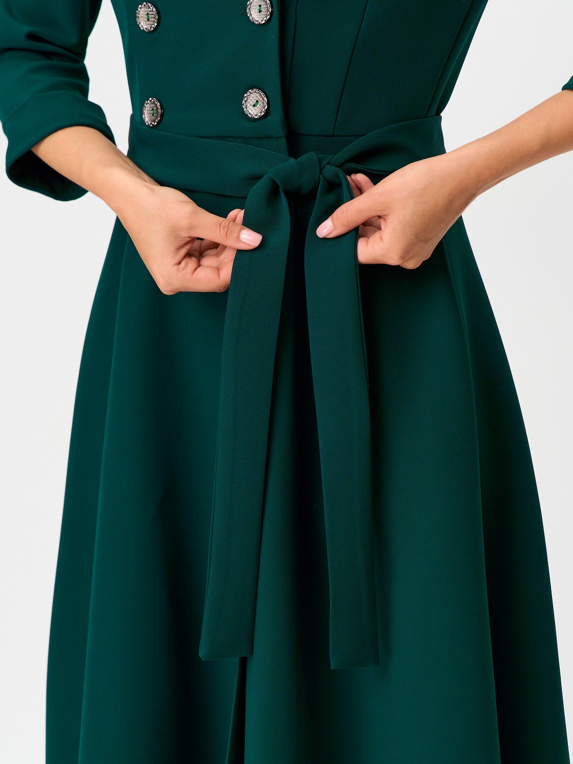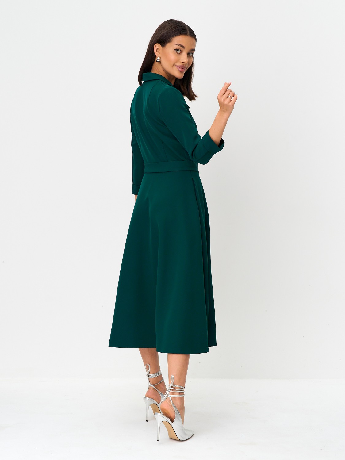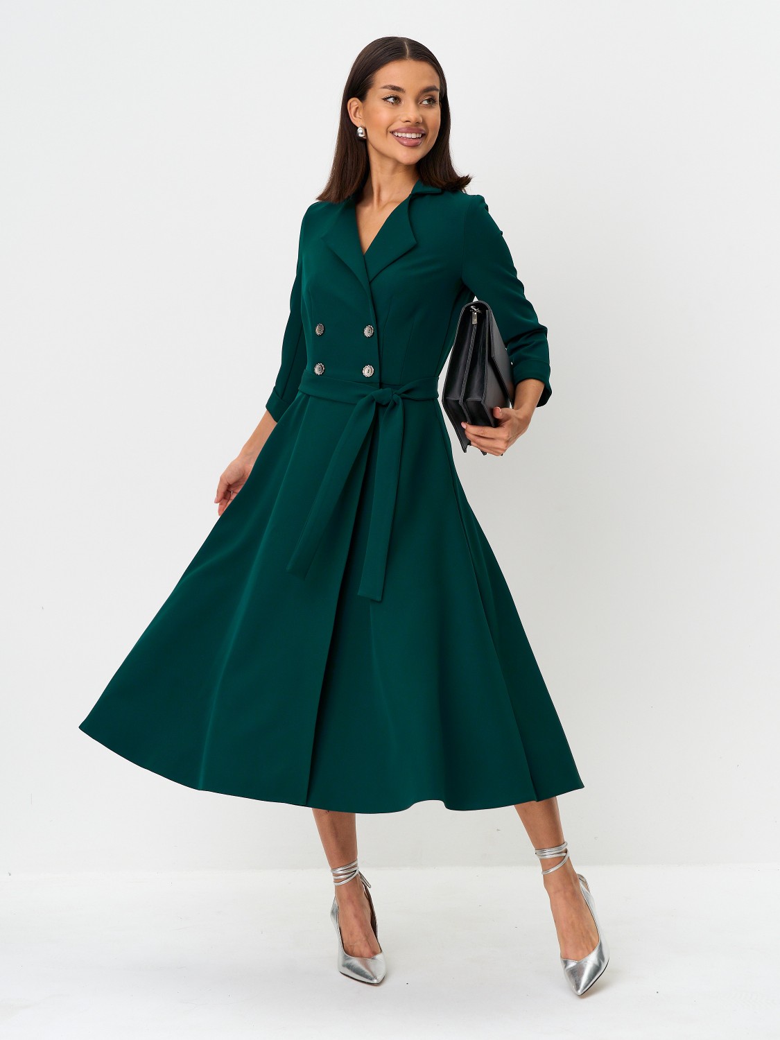 Стильное платье - пиджак миди с двубортным кроем и поясом — идеальное решение для тех, кто ценит элегантность и комфорт. Платье офисное универсального фасона на запах с отложным воротником и длинными рукавами подчёркивает фигуру, визуально стройнит и подходит для любого типа телосложения. Плотная ткань женского платья с добавлением эластана не просвечивает, устойчива к деформации и отлично держит форму. Высокий разрез спереди добавляет образу женственности и лёгкости в движении. Пояс на талии позволяет подчеркнуть силуэт и создать выразительный акцент. Длина миди до середины икры делает модель уместной в офисе, на деловой встрече, свадьбе в качестве гостевой одежды или вечернем выходе. Легко комбинируется с туфлями, балетками, кроссовками — подходит для создания образов в стиле smart casual, офисный шик или уличная мода. Универсальный крой и качественный крой делают это платье must-have в современном гардеробе.