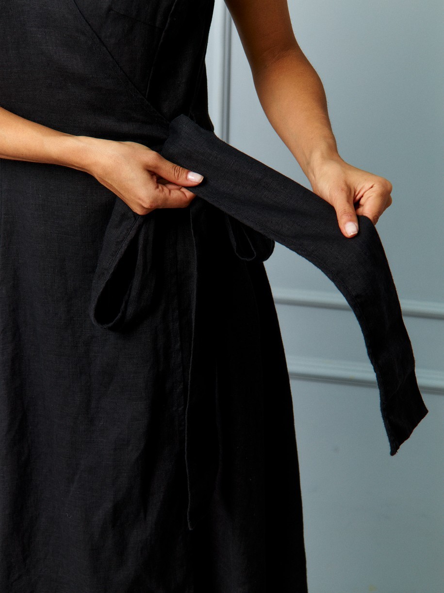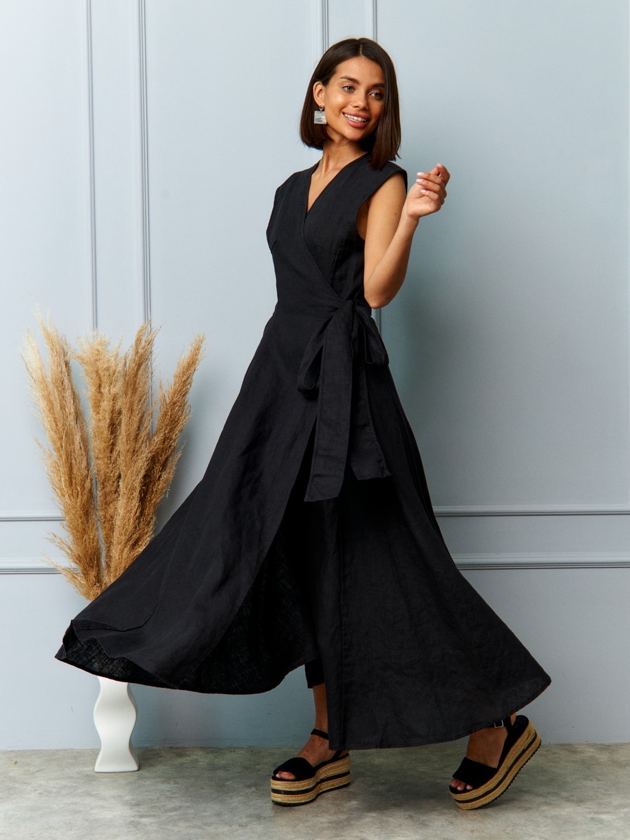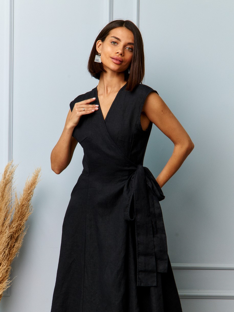 Льняное платье - это идеальный вариант для любого случая, сочетающее в себе стиль и комфорт.  Крой с запахом идеально облегает фигуру, подчёркивая талию, не сковывая движений. Пояс-завязка позволяет регулировать посадку, делая каждое платье уникальным — как будто сшитым специально под вас. Высокий разрез спереди добавляет изящества и движения, а прямой или слегка расклешённый силуэт — универсальности. Материал — 100% натуральный лён — это основа комфорта и устойчивой моды. Он дышит, охлаждает тело, не вызывает раздражения и становится мягче с каждым ношением. Это ткань, которая живёт с вами, адаптируется, становится частью вашего образа.