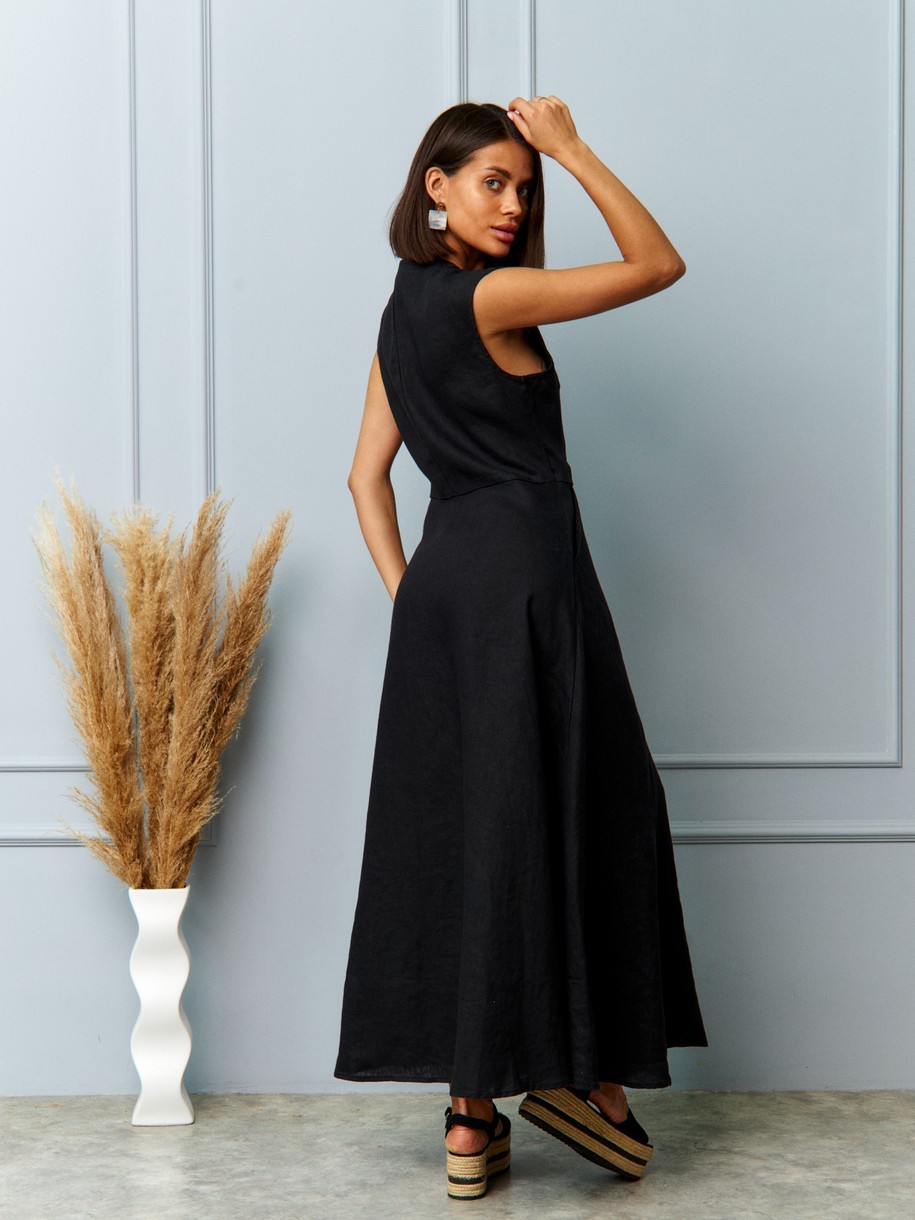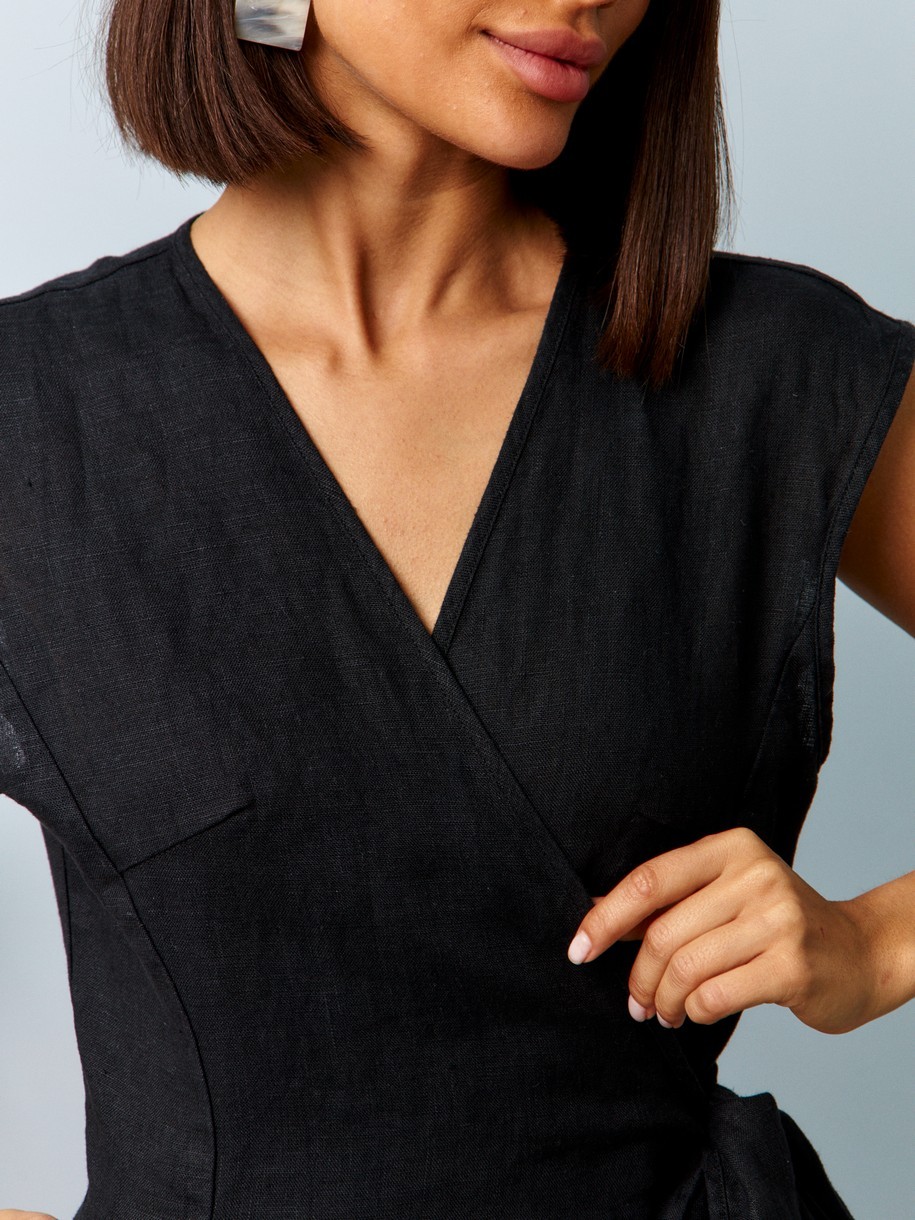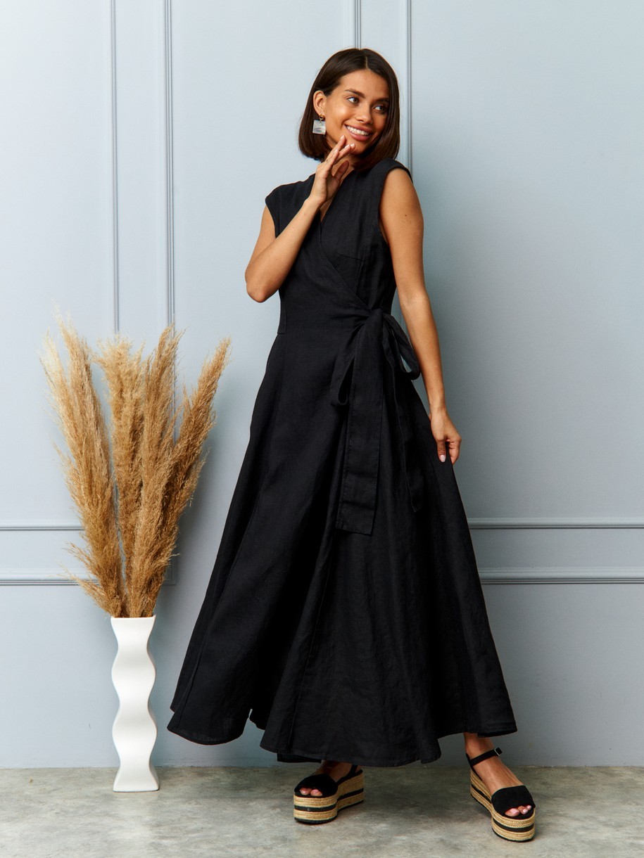 Льняное платье - это идеальный вариант для любого случая, сочетающее в себе стиль и комфорт.  Крой с запахом идеально облегает фигуру, подчёркивая талию, не сковывая движений. Пояс-завязка позволяет регулировать посадку, делая каждое платье уникальным — как будто сшитым специально под вас. Высокий разрез спереди добавляет изящества и движения, а прямой или слегка расклешённый силуэт — универсальности. Материал — 100% натуральный лён — это основа комфорта и устойчивой моды. Он дышит, охлаждает тело, не вызывает раздражения и становится мягче с каждым ношением. Это ткань, которая живёт с вами, адаптируется, становится частью вашего образа.