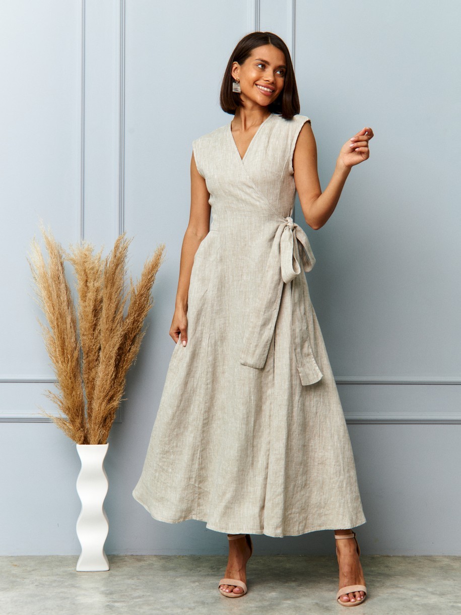 Льняное платье - это идеальный вариант для любого случая, сочетающее в себе стиль и комфорт.  Крой с запахом идеально облегает фигуру, подчёркивая талию, не сковывая движений. Пояс-завязка позволяет регулировать посадку, делая каждое платье уникальным — как будто сшитым специально под вас. Высокий разрез спереди добавляет изящества и движения, а прямой или слегка расклешённый силуэт — универсальности. Материал — 100% натуральный лён — это основа комфорта и устойчивой моды. Он дышит, охлаждает тело, не вызывает раздражения и становится мягче с каждым ношением. Это ткань, которая живёт с вами, адаптируется, становится частью вашего образа.