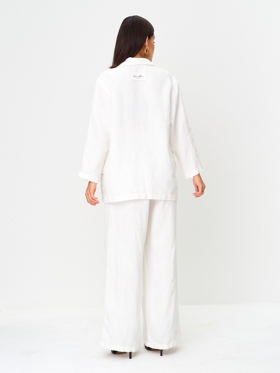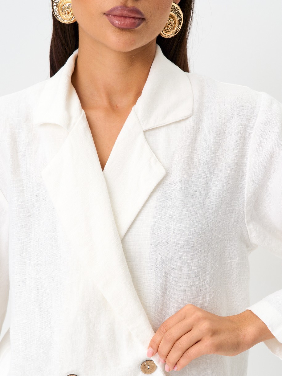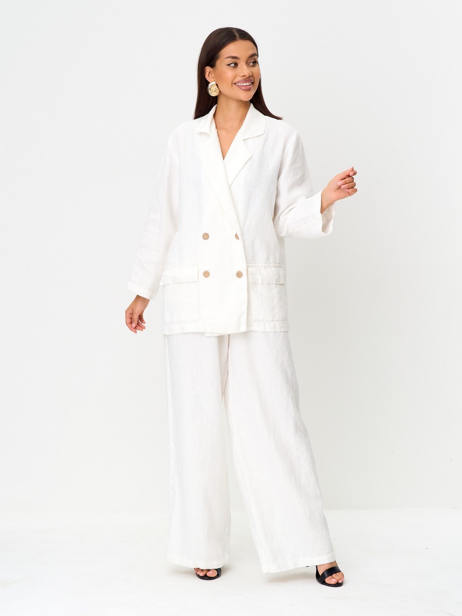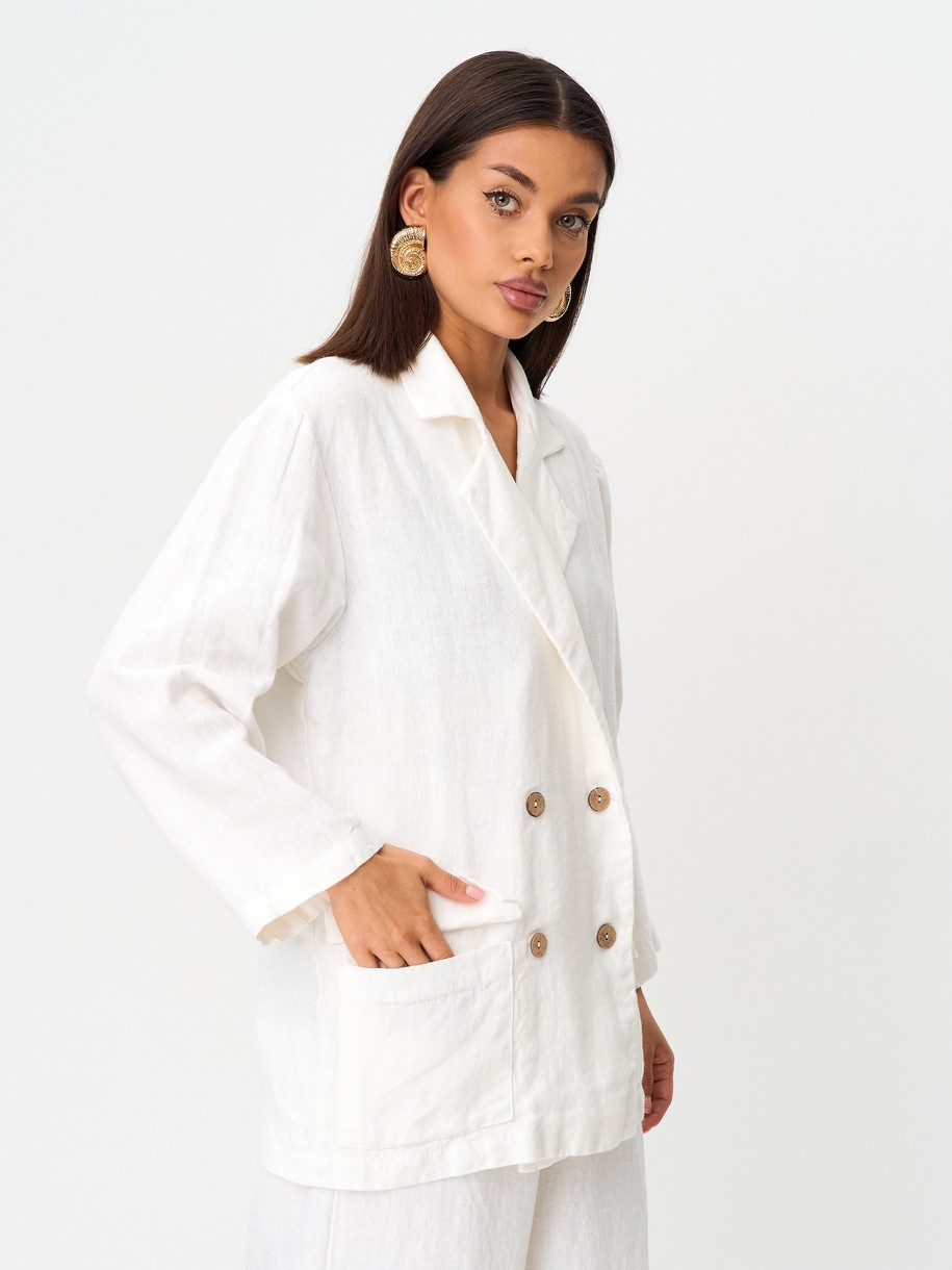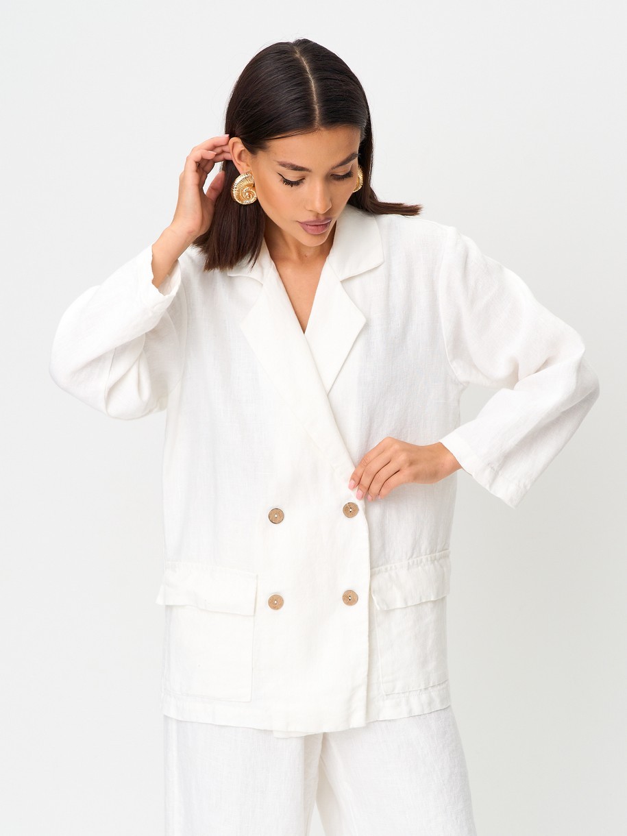 Льняной пиджак — воплощение лёгкой элегантности и деловой непринуждённости. Свободный двубортный крой с длинными рукавами и вместительными карманами выглядит одновременно структурированно и расслабленно. Пиджак легко сочетается с брюками, джинсами, платьями и юбками. Подходит для офиса, прогулок и путешествий — один пиджак, сотни образов. Это не просто верхняя одежда, а универсальный стильный акцент, который добавляет уверенности без усилий. Идеальное решение для современной женщины, которая ценит качество, комфорт и безупречный внешний вид.